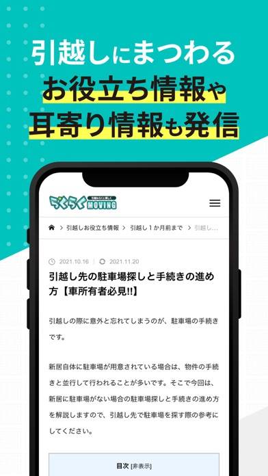 引越しに役立つ知識や引越し先の役所情報といった、多くの情報が手に入ります。おすすめガス会社や手続きで困った際の解決方法など、さまざまな記事を掲載。引越しの困りごとを解決できるアプリです。