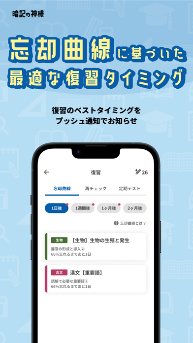 問題・解答・解説の読み上げ機能があり、耳から暗記することが可能。エビングハウスの忘却曲線の理論をもとに復習できる機能もあります。