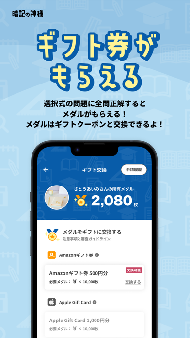 全問正解するとメダルをGETでき、このメダルをギフト券に交換できます。Amazonギフト券やApple Gift Cardなど、普段から利用しやすいものが多いのが嬉しいところ。たくさん勉強すればご褒美があるので、モチベーションも維持しやすいでしょう。