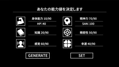 シナリオ開始時に決めたステータスで、ダイスロール成功率が変化。シナリオ中は100面ダイスを使い、ステータスの数値以下の数字が出たら成功します。ダイスロールは探索、戦闘、交渉などあらゆる面で使うので、数値の設定も重要です。