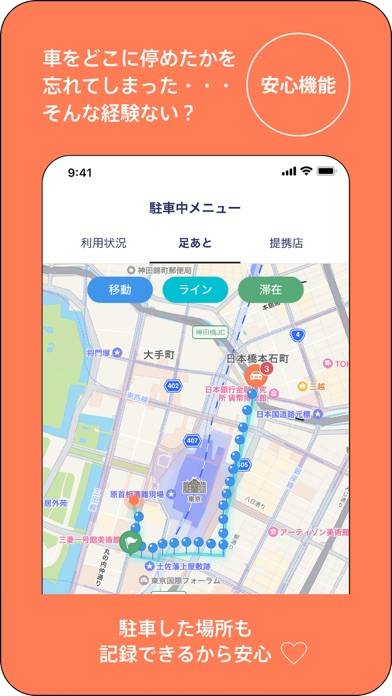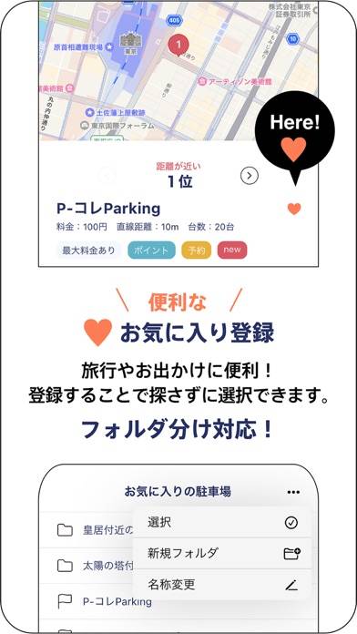 エリアを指定すると、マップ上に駐車場を表示してくれます。料金や対応している支払い方法などを掲載。他アプリと連携して、ナビをしてくれる機能もあります。気に入った駐車場があったら、画面右上のハートマークからお気に入り登録をしましょう。