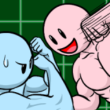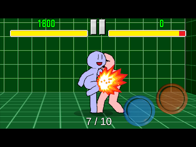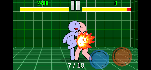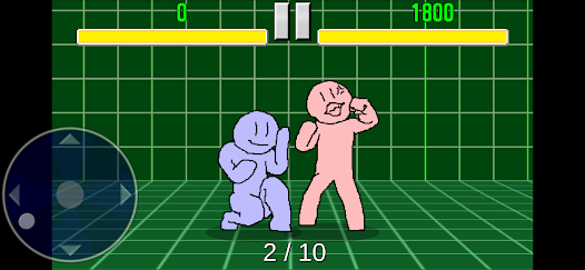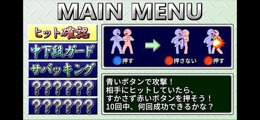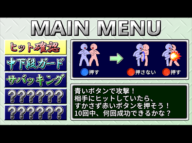 青いキャラを操作して、攻撃を繰り出していきます。赤いキャラにヒットしたらそのまま赤いボタンを連続で押してコンボ。ガードされたらボタンを押さない、格闘ゲームの基本の動きを練習できます。反射神経が鍛えられるでしょう。