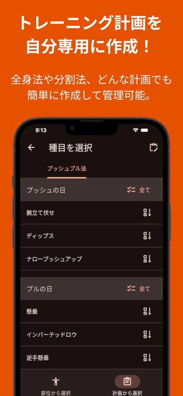 - 重点的に鍛える部位を決めたり、種目を追加したりと自由に計画できる