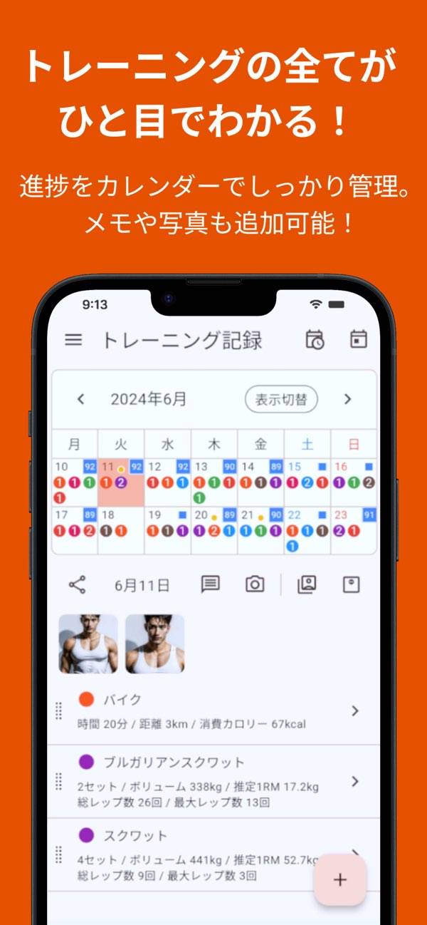 種目ごとに色分けしてカレンダーに表示されるので、鍛える項目が多い人にもおすすめ。自分に合った計画を立てて、効果的なトレーニングをしたい人にぴったりです。