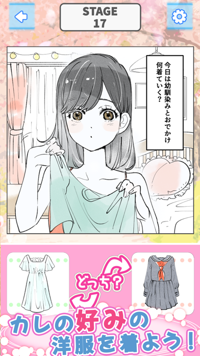 問題は2択形式で出題されます。正解の選択肢を選ぶと次の問題に移ります。1ステージにつき問題は4問程度などで、サクッと遊べるのが特徴。学園モノの恋愛マンガが好きな人はきっとハマるでしょう。