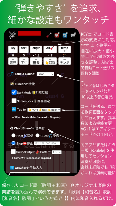 - Youtube動画を流しながら、弾き語りの楽しさを味わえる