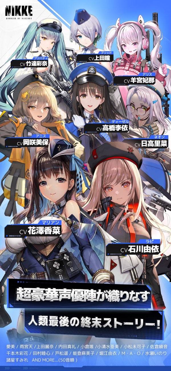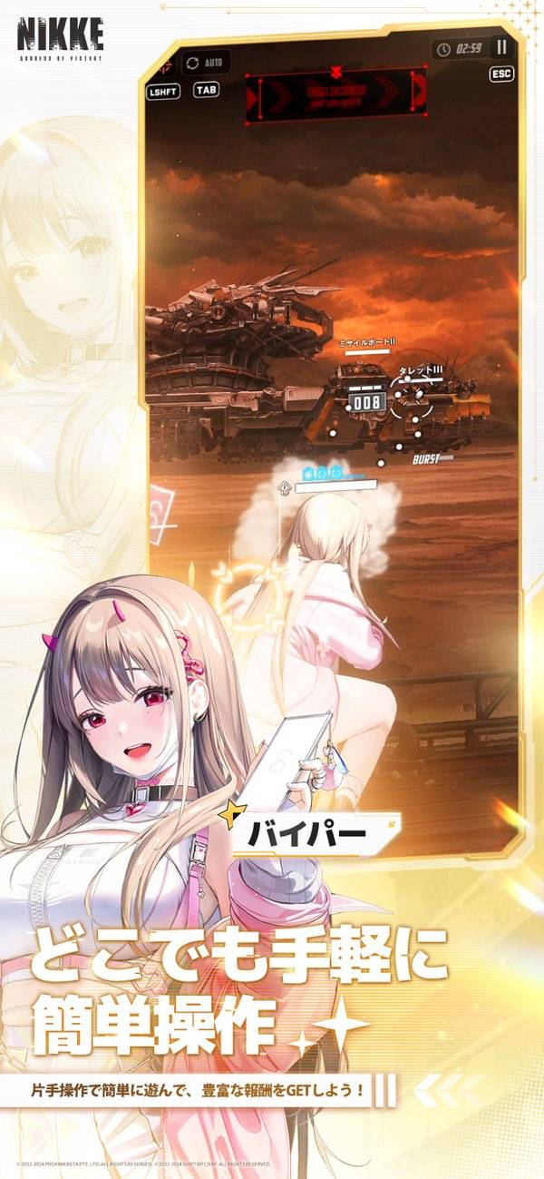 退廃的な世界を舞台に、少女たちが銃器を手に戦うコントラストが目を引くガンアクションRPG。謎の機械系生命体「ラプチャー」に侵略された地上を舞台に、少女型兵器「ニケ」と共に過酷な世界を戦い抜いていきます。