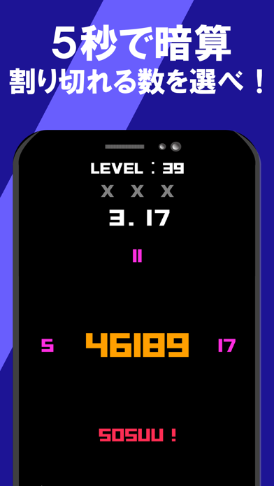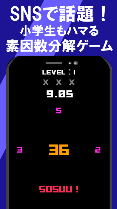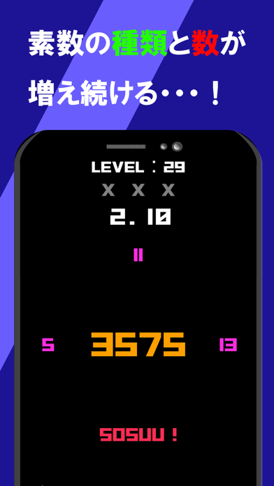 真ん中の数字をフリックして素数を目指していくゲームです。素数が完成したら下側にある「SOSUU!」に数字をフリックすると次の数字が出題されます。制限時間があるのでスピード感を持って取り組みましょう。