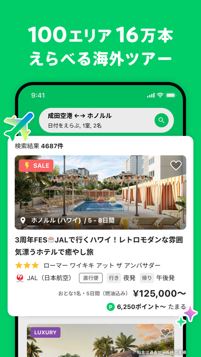 旅の予定をぜんぶまとめて管理できる旅行アプリ。目的地や予算を入力するだけでツアーや宿泊先をかんたんに検索できます。飛行機やホテルの予約からスケジュールの確認まで、スマホひとつで旅がまるごと完結。これさえあれば、旅の不安がグッと減ります。