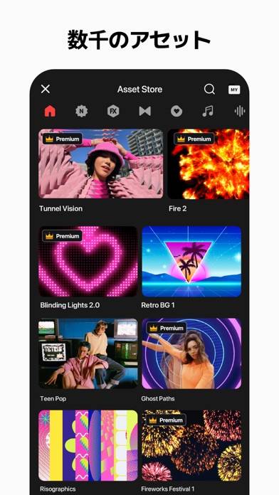 動画素材やエフェクトを、自分好みにカスタマイズできる動画編集アプリ。各素材はストアからダウンロードして利用します。気に入ったものだけを保存しておけるため、アプリ自体が重くなりにくいのが特徴。ここでしか使えない、テンプレート素材が豊富に揃っているのが魅力です。