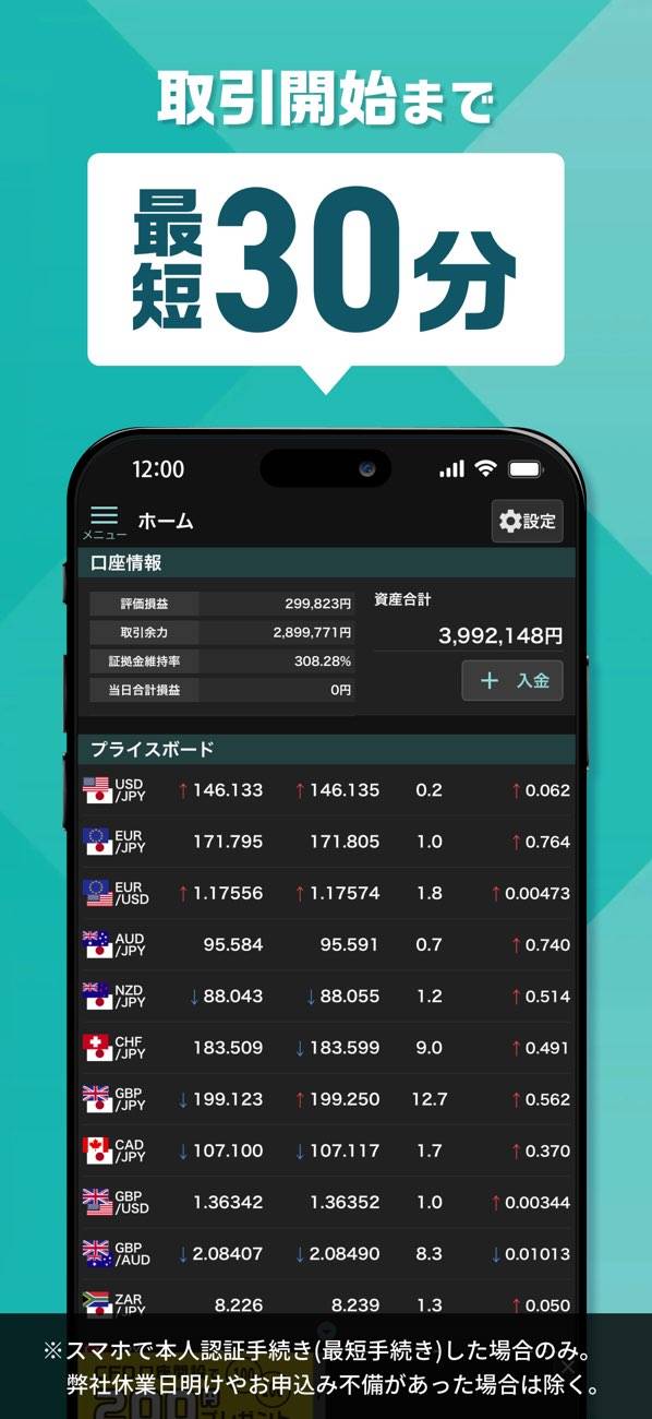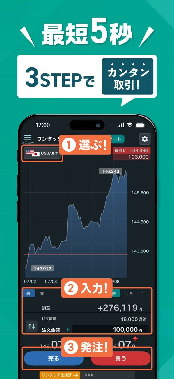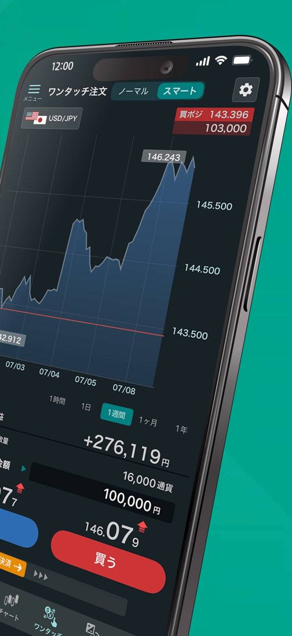- 相場分析がしやすいチャート画面。ワンタッチ注文機能も搭載