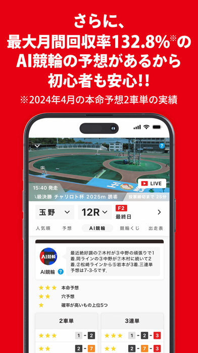 投票の判断材料となる情報・機能も豊富。レース前の選手コメントもしっかり確認可能。また北海道大学との共同開発の「AI競輪」のデータも参照可能。データで試合を予想するのに十分な情報量です。