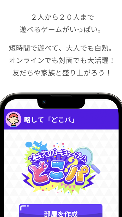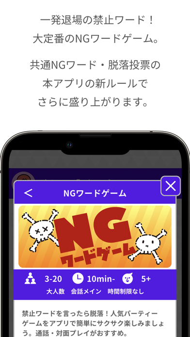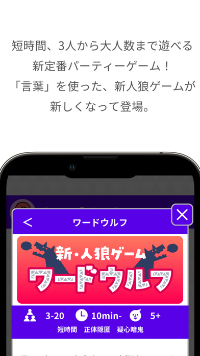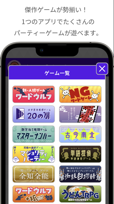 2~20人で遊べるオンラインゲームアプリです。「ワードウルフ」や「NGワードゲーム」を中心に、14種類がラインナップ。ゲームの種類は今後も追加予定です。