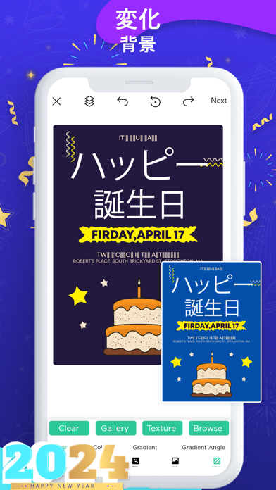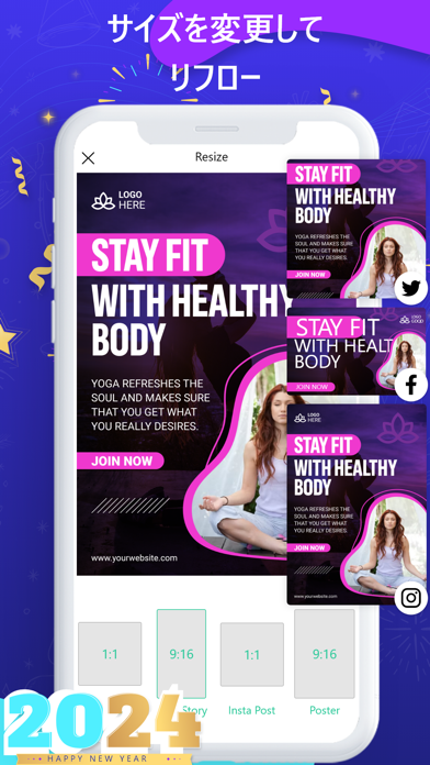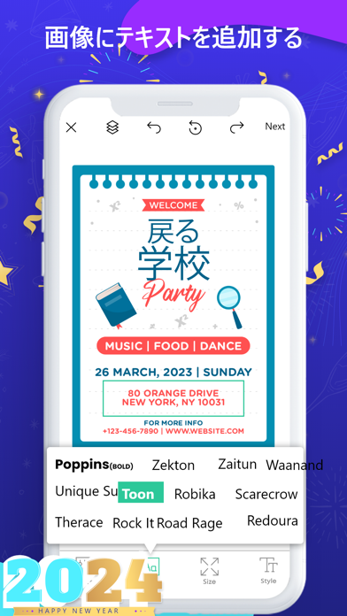 デザイン変更やテキスト追加など、直感的な操作で編集できます。文字の色やフォントサイズも自由に設定して、テーマに合わせたポスターを作ってみましょう。完成したポスターは写真フォルダに保存できるのに加え、各種SNSでも共有可能です。
