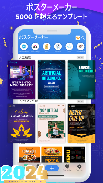 自由度の高いデザイン編集ができるポスター作成アプリです。ビジネス用やプライベート用など、テーマに合わせて使えるテンプレートが多数ラインナップ。