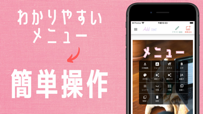 「テキスト追加」をタップして文字を入れていきます。文字の大きさはもちろん、太字や縦書き字間など細かく調整できるのも嬉しいところ。ポップアップメニューもシンプルで見やすいため、使いやすさもバツグンです。