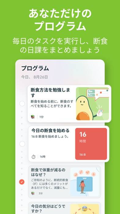 - タイマーで断食時間を管理。断食中の体の状態を丁寧に教えてくれる