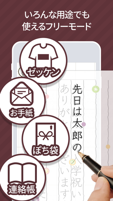 アップデートでフリーモードを追加しました。横書きにも対応しましたので、子供の体操服や水着につけるゼッケンや、簡単なお手紙の下書きにも使えるようになりました。