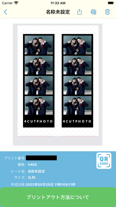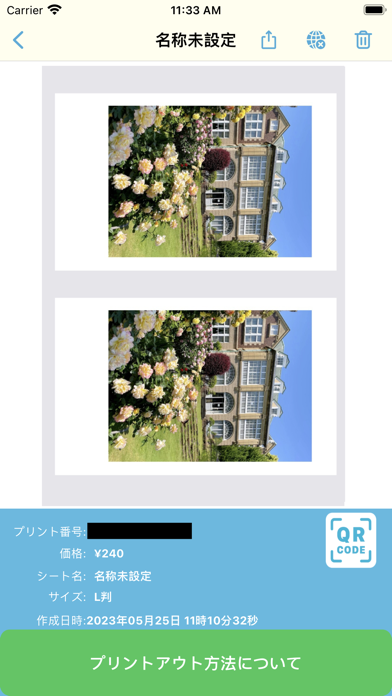プリント用の番号とQRコードが自動で発行されるので、対応しているローソンのコピー機で簡単に印刷できます。スマホで作ってコンビニで手に入るのがうれしいポイントです。
