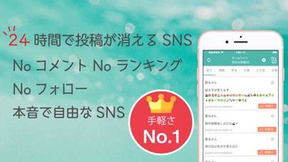 表示名は匿名さん、24時間で投稿が消えるSNS。家族や友人には伝えたくないけど、声を大にして叫んでしまいたい思いがある人必見のアプリです。フォローシステムがないため、人とのしがらみに縛られる心配ナシ。投稿内容は24時間後に必ず消えるため、発言を見返してつい気持ちが病んでしまう心配もありません。