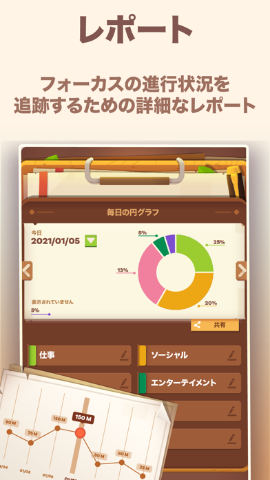 集中した回数や総時間数をグラフでチェック可能。また円グラフを表示させれば、仕事や勉強、休憩にどの程度の時間を使っているかがわかります。