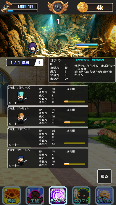 10年以内にドラゴン討伐を目指し、冒険者学校で生徒を育成するSLGです。学園の授業をグレードアップさせたり、育てた生徒たちをダンジョンに連れて行ったり、経営と育成の2つの要素を楽しめます。ジョブの変更やスカウトなども使いながら、あなたの方針で最強の冒険者を育て上げましょう。