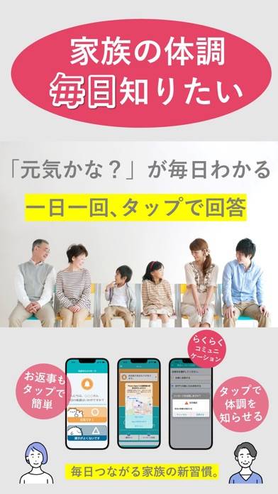歳をとった父が地元で1人暮らしているため、毎日の体調確認のためこのアプリを使い始めました。父は80歳を超えており、今までスマホのメッセージが苦手でした。ただこのアプリは、通知からすぐに健康確認ができるので使いやすいとのこと。私と似た境遇の人は、ぜひ使ってみてください。