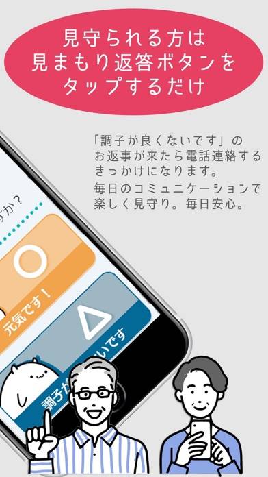 歳をとった父が地元で1人暮らしているため、毎日の体調確認のためこのアプリを使い始めました。父は80歳を超えており、今までスマホのメッセージが苦手でした。ただこのアプリは、通知からすぐに健康確認ができるので使いやすいとのこと。私と似た境遇の人は、ぜひ使ってみてください。