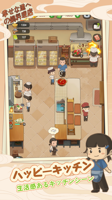 あなたは火鍋レストランのオーナーとしてお店を経営していきましょう。お客さんの上に表示される吹き出しをタップすると、料理が自動で作られます。そして料理の上に表示されたアイコンをタップして提供。これらを繰り返して資金を稼いでいきます。