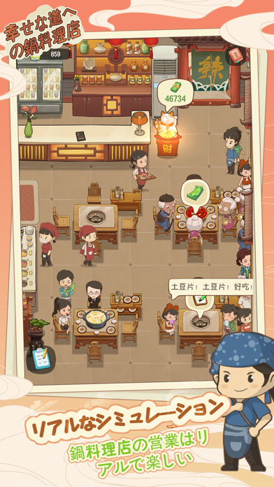 料理や火鍋を提供すると売り上げが増えていきます。資金を使用してカウンターやテーブル、店外にテントなどを設置してお店を大きくしましょう。スタッフの雇用などもでき、キャラクターが動いている仕草を見ているだけでも飽きないですよ。