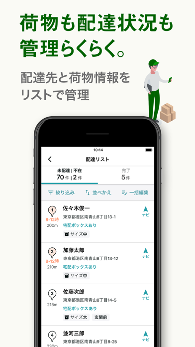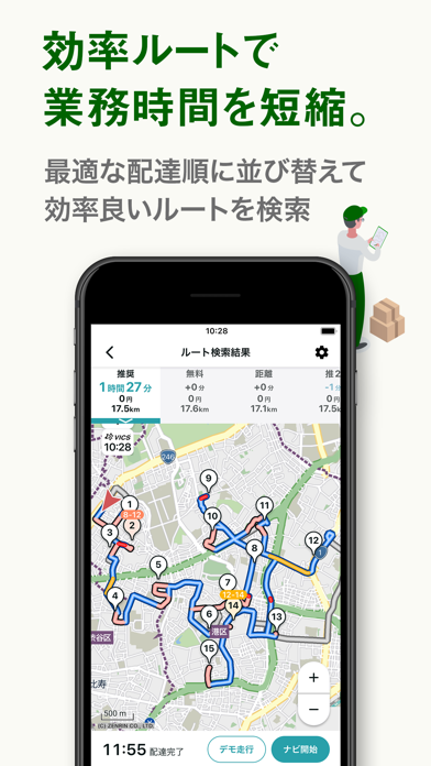 正確な住所と配達順をナビゲートし、時間帯指定に応じた最適な最短ルートを表示。他にも伝票読み取りなど、配達効率を上げる機能をしっかり搭載。プレミアムコースに加入すると、ゼンリン住宅地図で建物の詳細も把握できます。また、登録した分の何%が完了しているかひと目で把握。