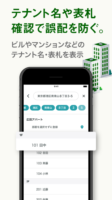 有料プランに加入すると、建物の名称から表札情報まで、詳細にチェックできる地図を表示。タップ一つでマンションの階数や部屋番号を表示し、配達先を正確に把握できます。誤配のリスクを減らし、配達の正確性が向上します。