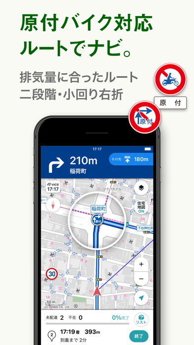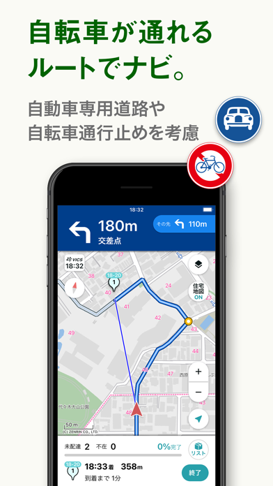 正確な住所と配達順をナビゲートし、時間帯指定に応じた最適な最短ルートを表示。他にも伝票読み取りなど、配達効率を上げる機能をしっかり搭載。プレミアムコースに加入すると、ゼンリン住宅地図で建物の詳細も把握できます。また、登録した分の何%が完了しているかひと目で把握。