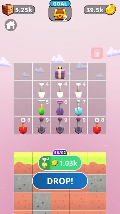 スコップで穴掘りをするマージ系パズルゲームです。同じスコップを2つ合わせると強化できます。5マスの中から好きな場所を選び、スコップを落としたらあとは見守るだけ。最下層にある宝箱についたら、ステージクリアとなります。