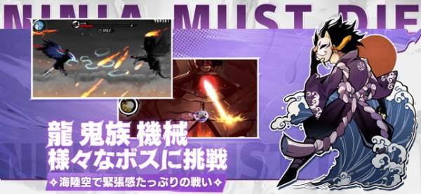 手裏剣、弓などの武器スキル、忍術といった攻撃手段の使いこなしも重要です。ステージによってBOSS戦に挑むことも。BOSS戦でも敵の攻撃をかいくぐる必要があるため、緊張感あふれるスピーディーな戦いを楽しめます。