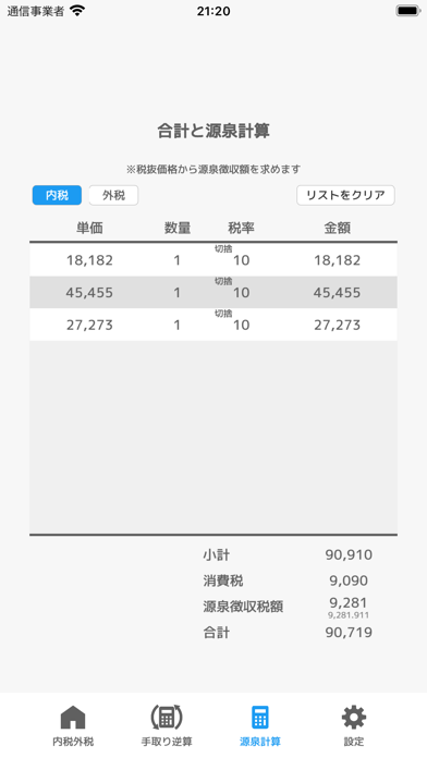 複雑な源泉計算も自動的に行ってくれます。ユーザーは税込or税抜価格を価格を入力後「源泉計算へ追加」をタップするだけ。税込価格で入力した場合、自動的に税抜価格を単価としてリストに追加してくれます。リスト表で数量の変更も可能。