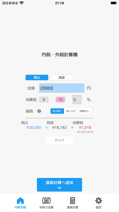 - 金額を入力するだけで消費税を算出。税率の切り替え、端数の設定も可能