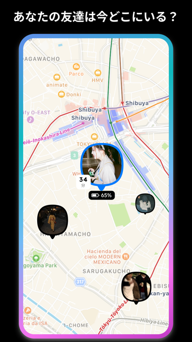 自分と友達の位置情報を把握し合える位置情報共有アプリです。『zenly』をリスペクトして作られており、充電残量の把握やスタンプの送信などが可能に。メッセージ機能もついており、待ち合わせの際にも活用できます。日本製のアプリなので安心感もあります。