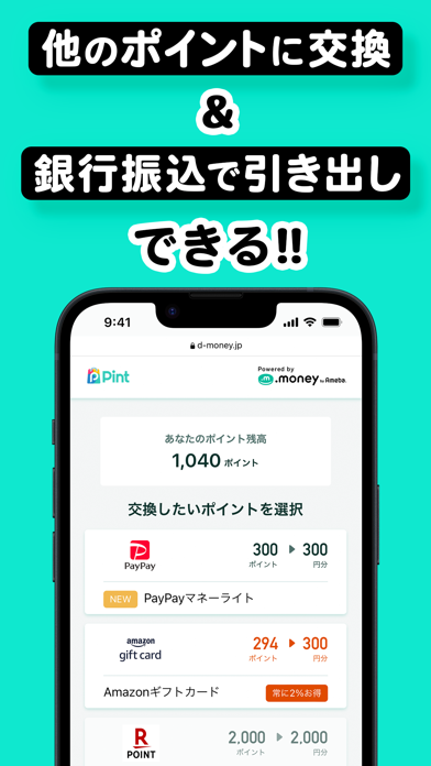 獲得したポイントは、1pt=1円で銀行口座に振り込み可能。マイナンバーカードや運転免許証などの本人確認書類を提出し、出金先の登録を済ませればポイントの出金ができます。各ECサイトで使えるギフト券などへの交換にも対応しています。