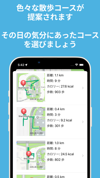 歩く時間と速さを決めるだけで、ぴったりの散歩道がいくつも見つかるアプリ。5つのルート候補から気分に合ったものを選んで、迷わず気持ちよくお出かけできます。歩数やカロリーも自動で計測されるので、健康管理にも役立ちますよ。
