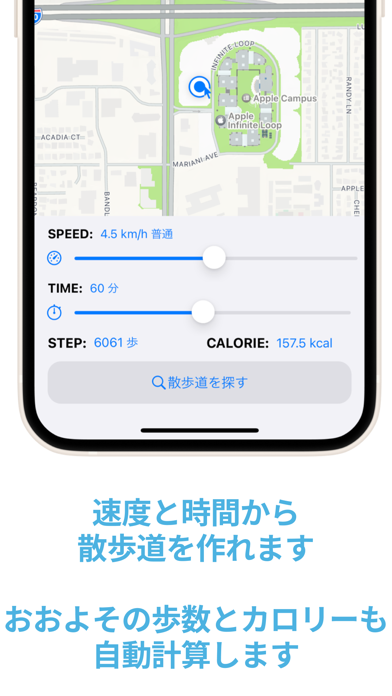 その日の体調や気分に合わせて、時間と歩くスピードを入力するだけで5つの散歩道が表示されます。いつもの道を離れて、新鮮な景色を楽しめる経路も。往復するか目的地に到着した時点で終了かも選べるので、リラックスしたいときや買い物ついでにも使えますよ。