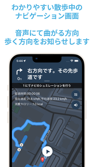 散歩をスタートすると、地図上にルートと自分の位置が表示され、進む方向を音声で案内してくれます。途中で曲がる場所や曲がるタイミングも知らせてくれるから、知らない道でも安心。歩数やカロリー、現在のスピードもリアルタイムで確認できます。