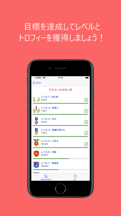 飲酒を避けた日数をカウントし、目標を達成することでトロフィーを獲得。これにより、禁酒生活がゲーム感覚で楽しめ、モチベーションが持続しやすくなります。さらに、進捗をフォローアップする機能で、自分の禁酒履歴を振り返り、成功体験を確認できるのが魅力です。