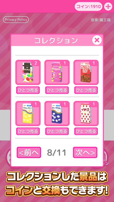 各ステージで獲得したお菓子はコレクションに保存されます。お菓子の獲得数を右上に表示。余ったお菓子は売ってコインに変換できます。遊びたいのにコインがない! そんなときには、コレクションからお菓子を売ってみましょう。