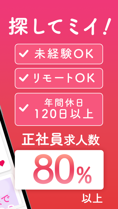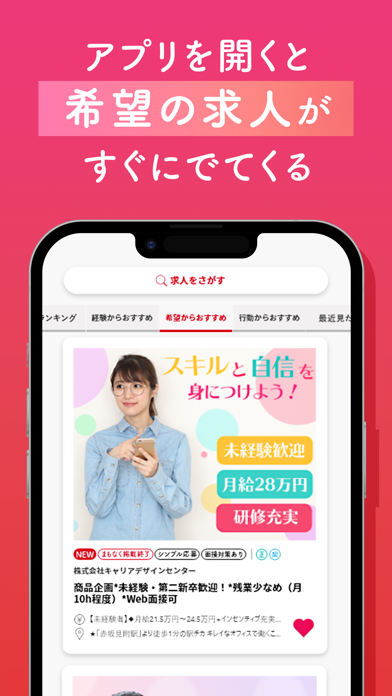希望の条件に沿った求人情報を見つけられる女性のための転職アプリ。正社員募集の求人が8割以上あり、求めていた仕事が見つかりやすいでしょう。またあなたのプロフィールを見た企業からオファーが届くスカウト機能搭載。活躍しやすい環境をアプリで探してみてはいかがでしょうか。