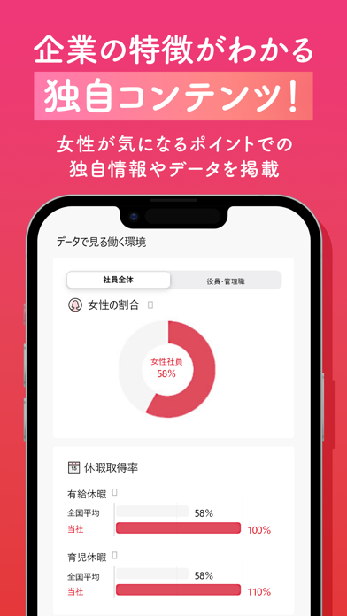 女性社員の比率や育児休暇取得率などをデータでチェックできます。職場環境が気になる人は、求人詳細から見られるので、事前に確認しておくといいでしょう。働きやすさ重視の人に嬉しいデータです。