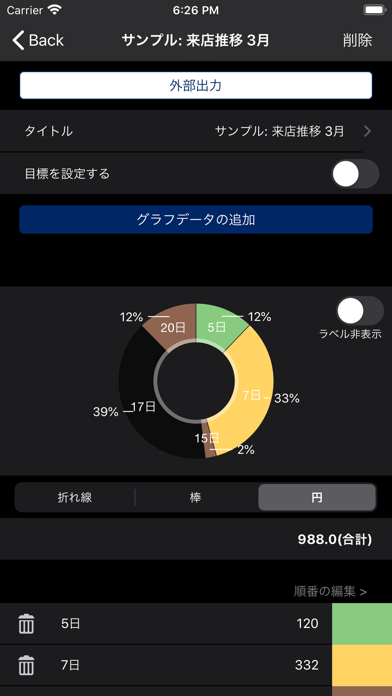 - 用途に合わせて円グラフ、棒グラフ、折れ線グラフが使用可能。