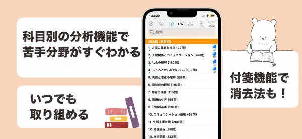 ジャンルごとに介護福祉士の試験問題に取り組めるアプリ。問題ごとに正解率が表示されており、難易度の指標にできます。また模擬試験が4つ用意されており、本番さながらの状態で取り組めます。間違えた問題は解説してくれるので、理解をより深められるでしょう。
