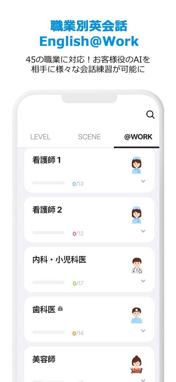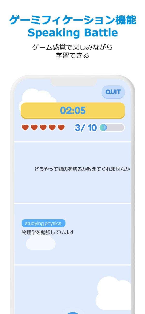 AIを相手に学習できるので気軽に英会話学習ができます。「人物相手だと緊張してうまく話せない」そんな人におすすめ。本アプリには5つのレベルがあり、自分のレベルや上達具合に合わせて難易度を選べます。