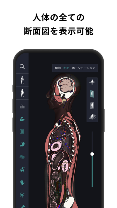 まずは画面左のアイコンをタップして、表示させる部位を選択します。拡大したり視点を変えたりと自由に観察できるのが魅力。断面図に切り替えることもでき、より詳しく解剖できます。